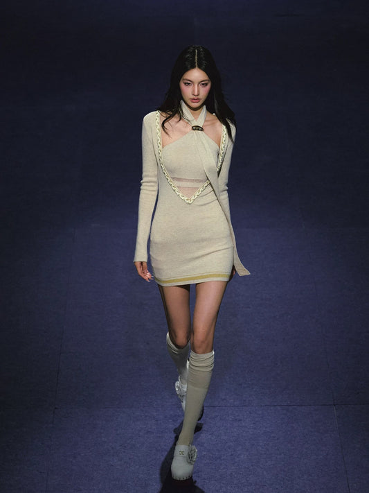 Champagne Woven Layered Two-Piece Dress with Sheer V-Neck Tie Detail