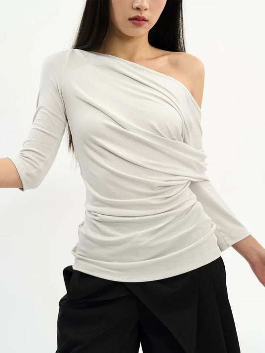 Asymmetric Off-the-Shoulder Ruched Top - Grey Slim Fit 3/4 Sleeve Blouse - Minimalist Avant-Garde Draped Shirt - INNA Collection