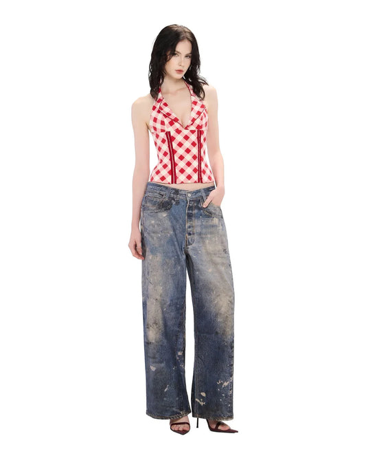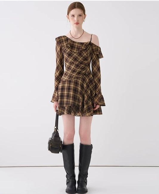 French Vintage Ruffled Plaid Dress – Irregular Hem Waist-Defined Dress