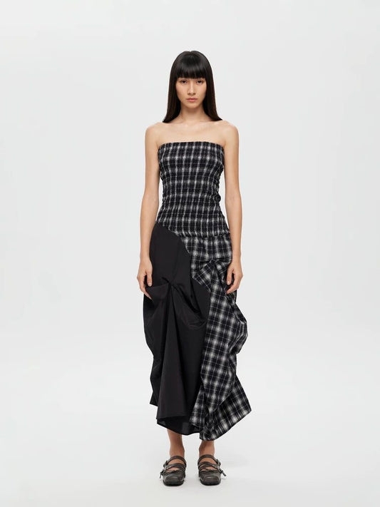 Dual-Wear Structured Plaid Strapless Maxi Dress