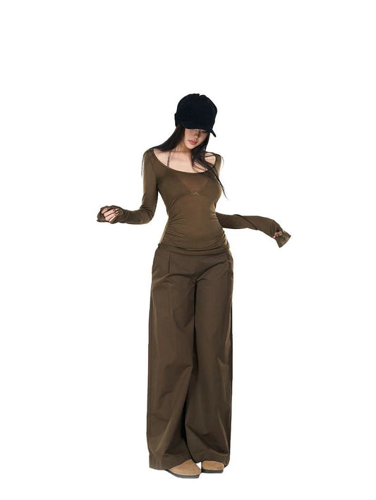 Patchwork Layered Sheer Skirt-Pants with Belt – Low-Saturation Chestnut Brown