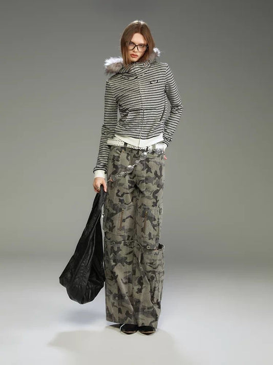 Vintage American Faux-Fur Collar Striped Hoodie Set – Crop Top & Shorts
