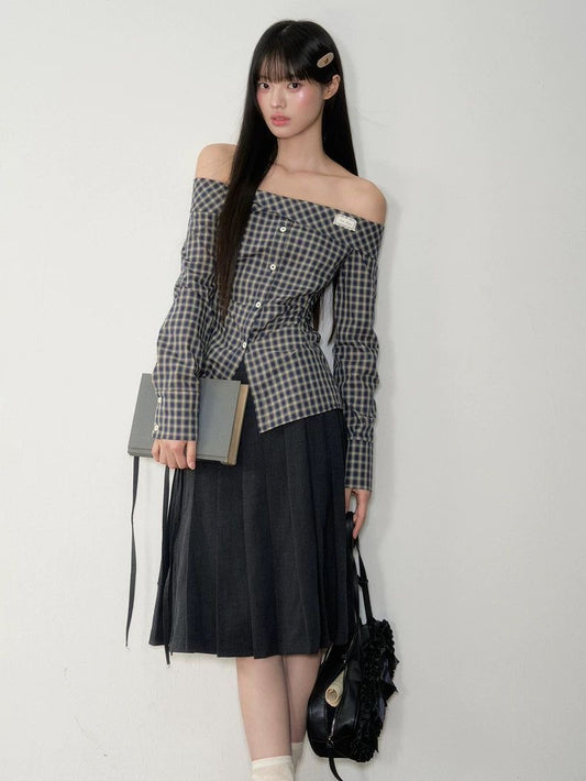 Navy Off-Shoulder Korean-Style Waist-Defined Slimming Plaid Shirt Dress