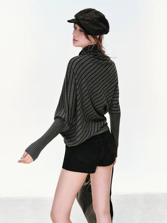 Striped Knit Polo Sweater – Batwing Sleeve Loose Fit Top
