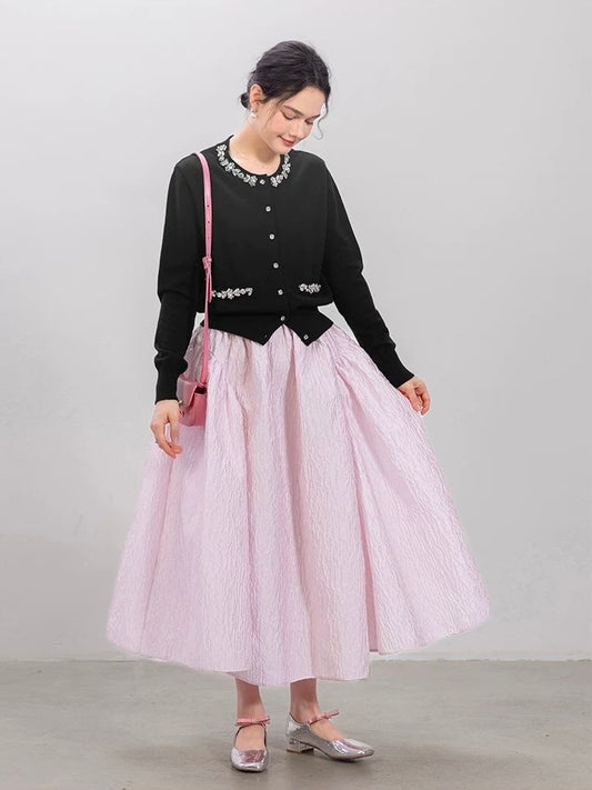 Jeweled Button Cardigan & Textured Midi Skirt Set