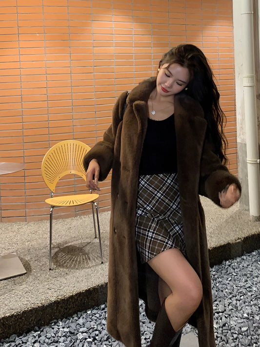 Luxury Full-Length Faux Mink Velvet Fur Coat – Dramatic Flared Hem, Coffee Brown Elegance