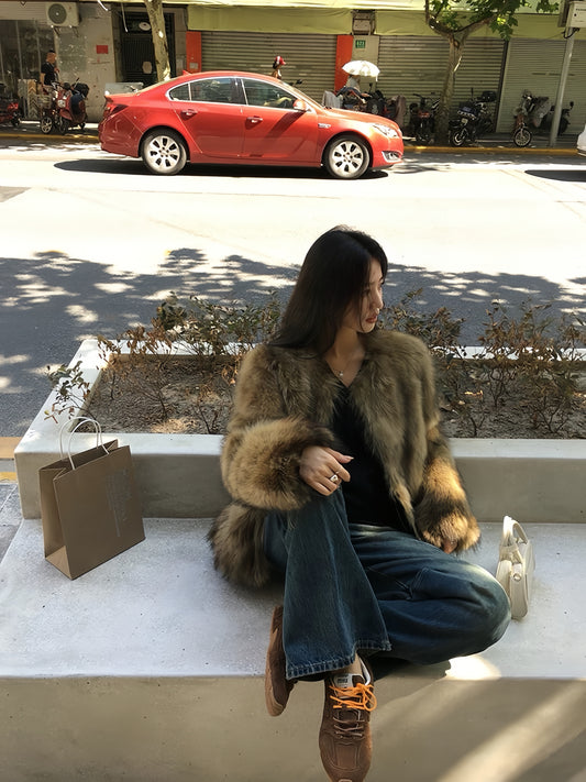 Luxe Eco-Friendly Fox Fur Coat – Thickened Brown Short Vintage Style