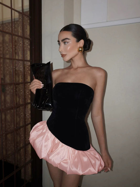 Sexy Y2K Style Patchwork Irregular Satin Pink Puffy Bustier Dress