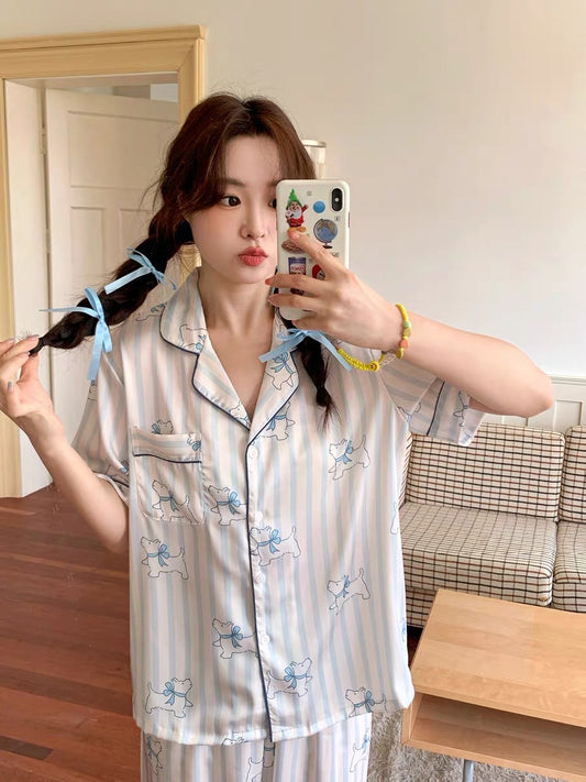 Blue Line Art Dog Print Short Sleeve Pajama Set