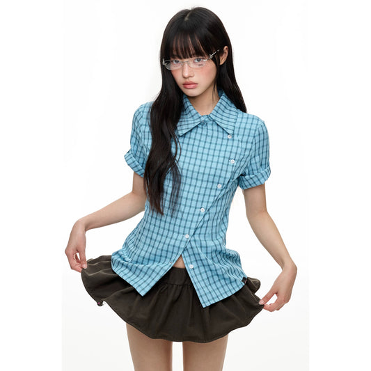 Blue Plaid Slim-Fit Short Sleeve Shirt – Colorblock Checkered Design