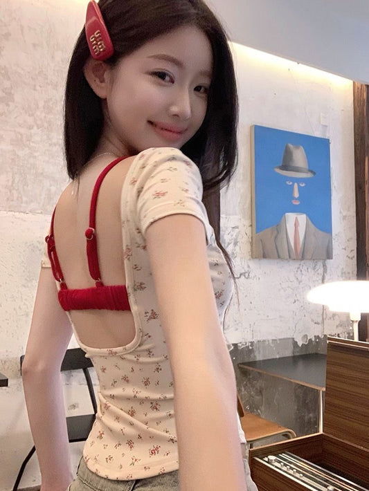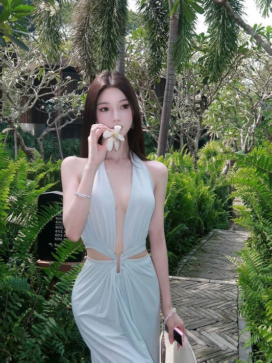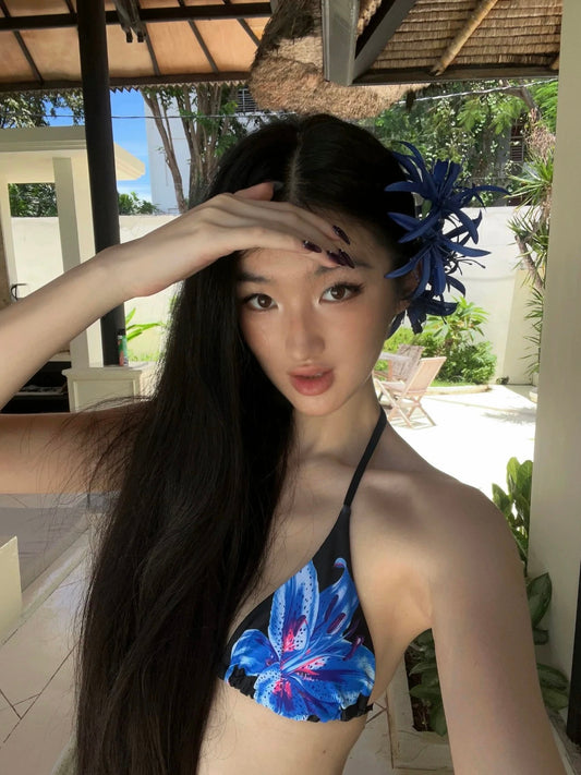 Blue Floral Halter Bikini & Mesh Cover-Up Set – 3 Piece Sexy Resort Outfit