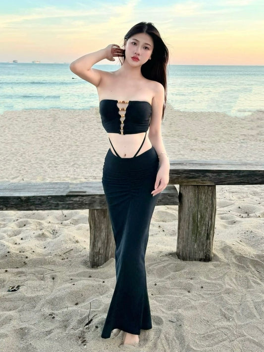 Pearl Strap Tube Bikini & Sheer Maxi Skirt Set – 3 Piece Elegant Resort Outfit
