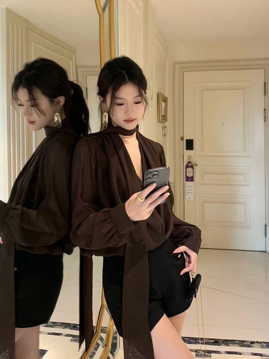 Sheer Chiffon Blouse & PU Leather Skirt Set with Belt