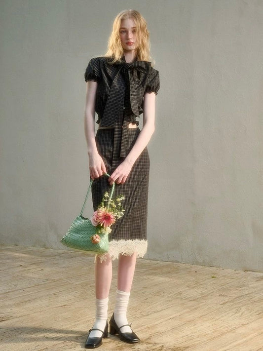 Checkered Bow-Tie Top & Lace-Trim Skirt Set