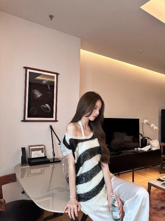 Off-Shoulder Black & White Striped Top – Soft Touch, Y2K Baddie Style