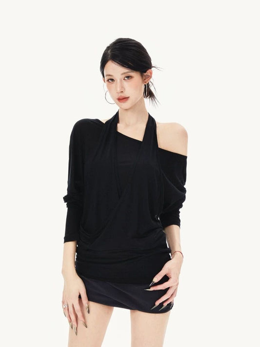 Black Halter Neck Batwing Sleeve Top with Layered Look