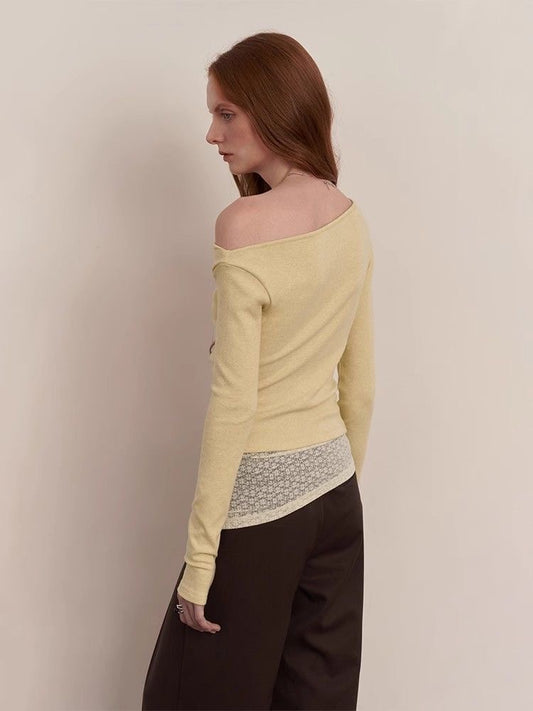 Cream Yellow Cowl Neck Knit Top with Lace Details