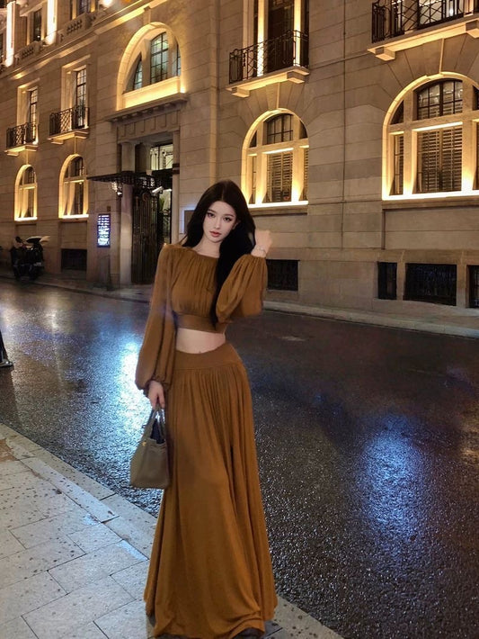 Elegant Pleated Two-Piece Set – Coffee Brown