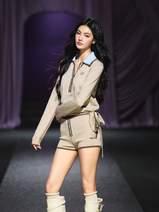 Contrast Trim Polo Ribbon Knit Top & Heart Shorts Set – Beige Coffee
