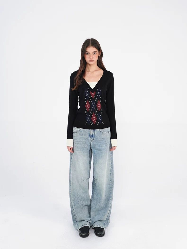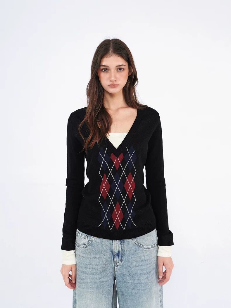 A refined classic reinterpreted for modern wear, this V-neck knit sweater features a timeless argyle pattern that adds subtle visual interest without overpowering the look. The clean neckline and slim silhouette create a flattering, effortless shape that layers easily or stands confidently on its own.