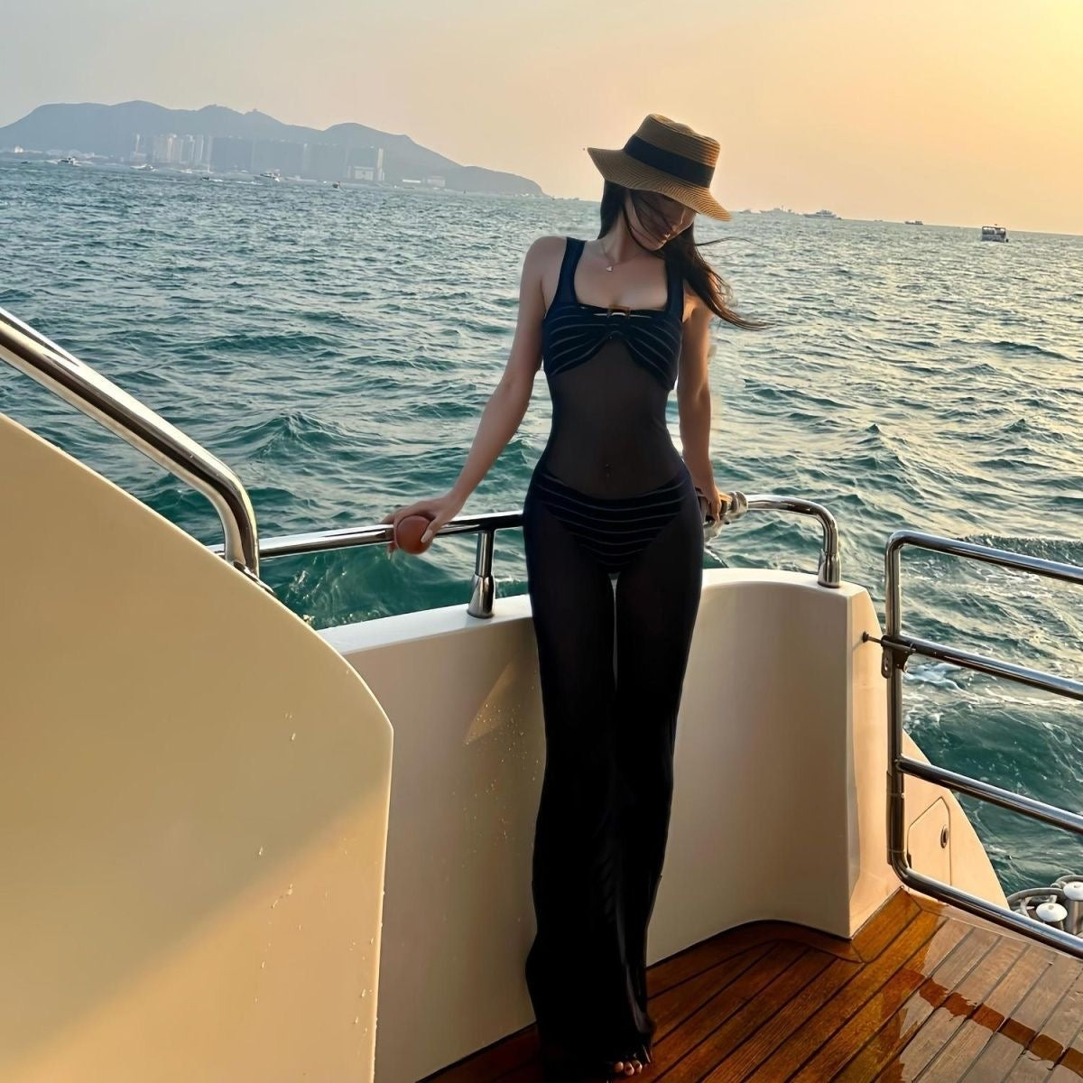 Turn heads at the beach with this deep blue sheer mesh beach cover-up, designed to be both sexy and elegant. Featuring a striped transparent pattern, lightweight breathable fabric, and a long maxi silhouette, it layers perfectly over any bikini. Ideal for seaside vacations, poolside lounging, or tropical getaways, this cover-up adds a chic and flirty touch to your summer look.