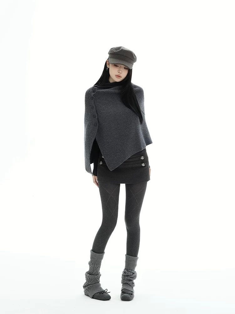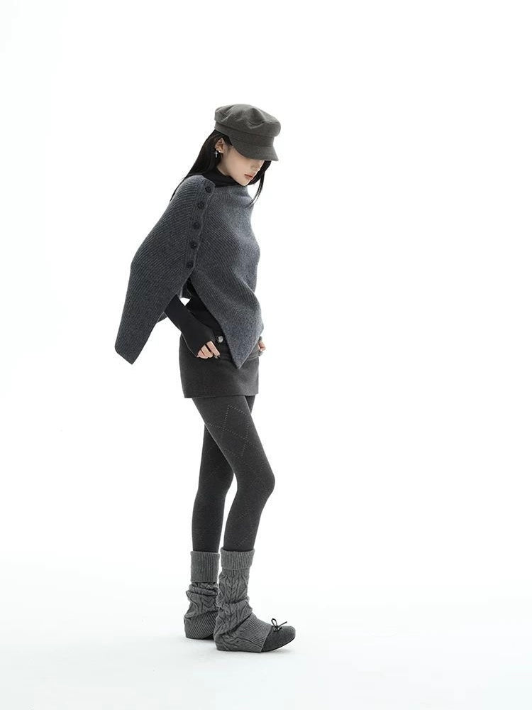 A sculptural knit set designed for modern layering and understated impact. The asymmetrical knit shawl drapes fluidly over the shoulders, creating a cocooned silhouette that feels directional yet effortless. Subtle button detailing along the shoulder adds depth and architectural interest.