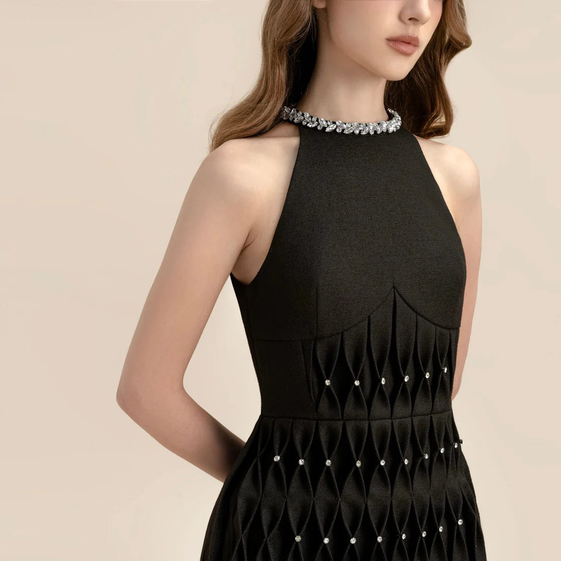 Featuring delicate smocking details, the silhouette gently shapes the body while allowing ease of movement. The neutral stone tone brings a clean, minimalist aesthetic, making it a versatile wardrobe essential for both casual days and elevated occasions.