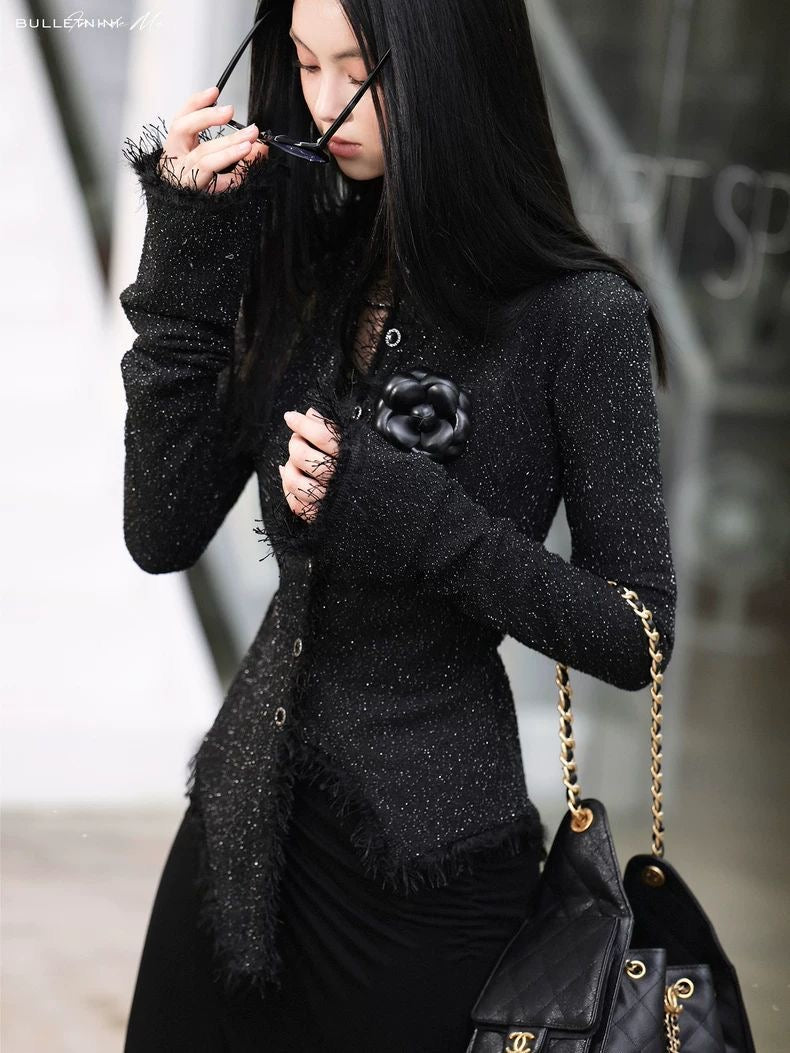 Its subtly shimmering fabric catches light with every movement, while the exaggerated cuffs and sharp shoulders evoke a sophisticated, editorial-inspired energy — ideal for evening wear, events, or a refined dinner look.