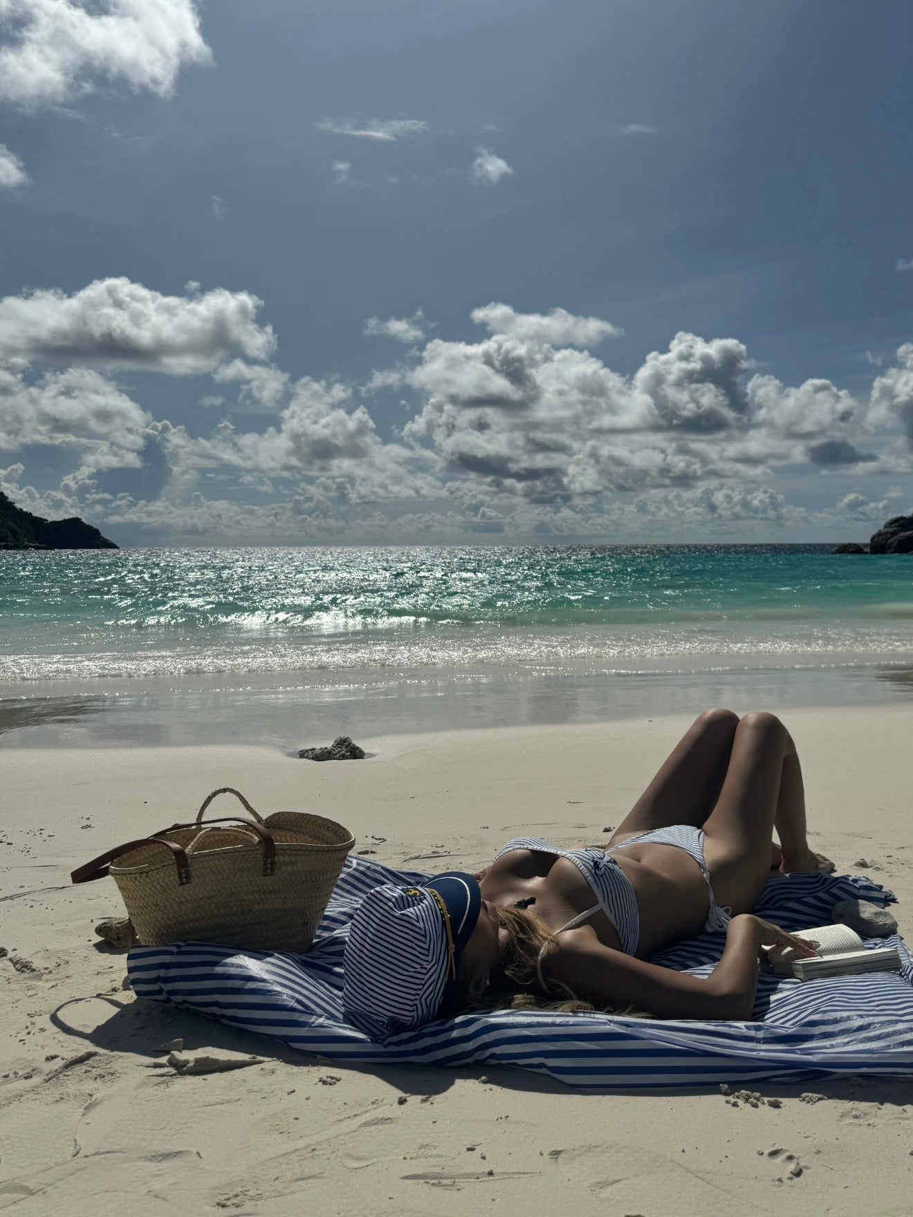 Lightweight yet absorbent, it dries quickly and folds easily into your bag—ideal for travel and everyday summer use. The rich navy tones add a clean, sophisticated holiday vibe to any beach look.