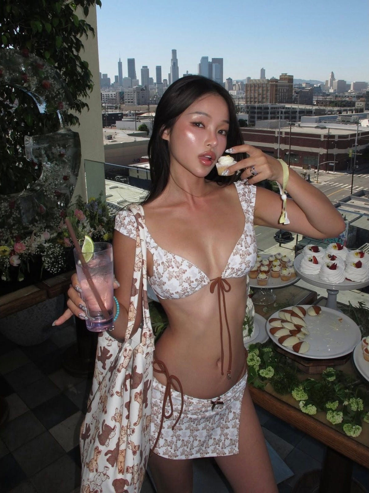 Bring a dose of fun and style to your beach days with this teddy print bikini set. The flattering triangle top features adjustable ties for a secure, customized fit, while the matching mini skirt adds a chic and playful twist, perfect for pool parties or seaside lounging. Crafted in soft, comfortable fabric, this set balances cuteness and confidence with ease.
