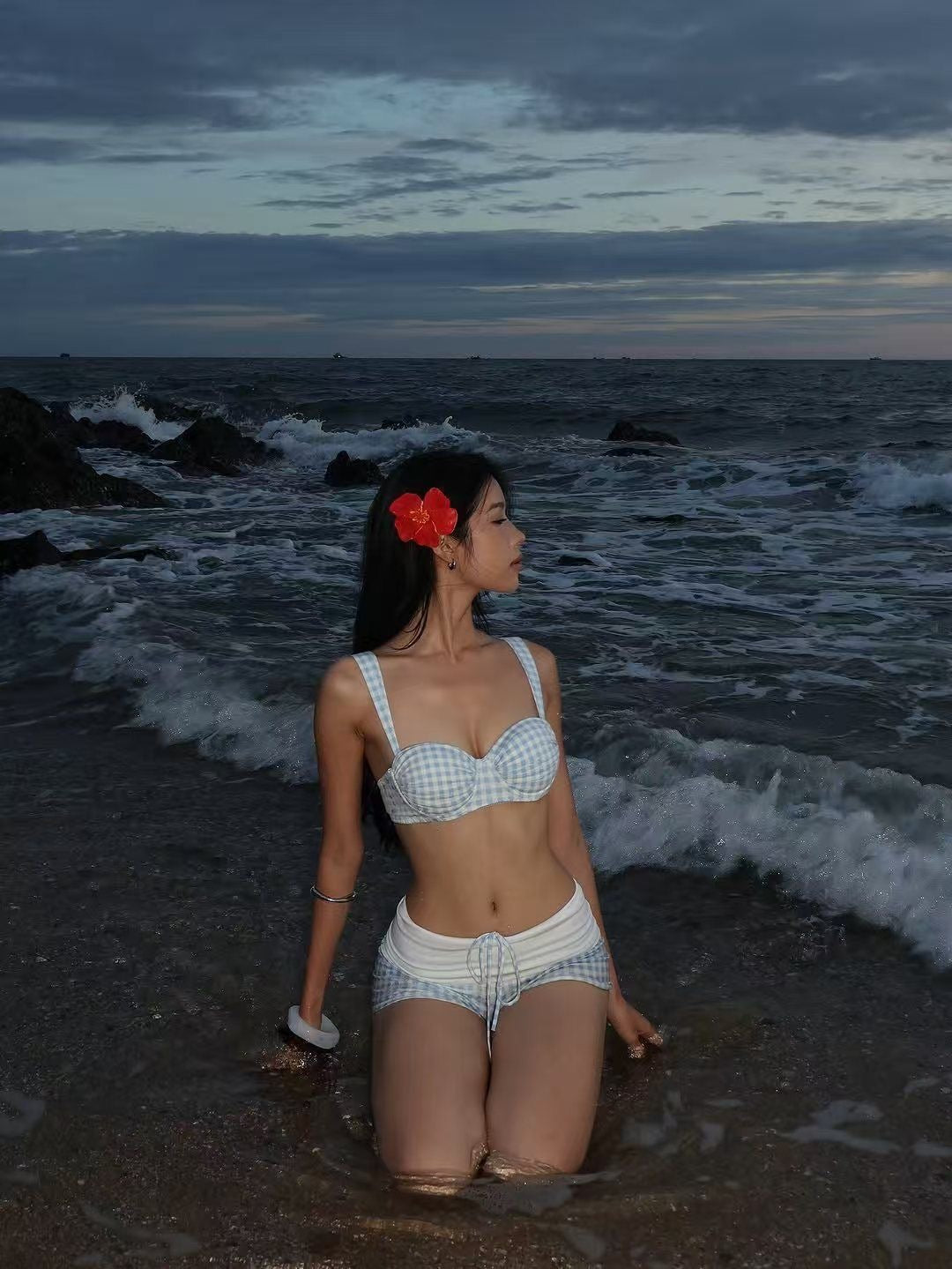 Inspired by vintage summer holidays, this blue gingham bikini set pairs a structured bikini top with matching drawstring shorts for a cute, relaxed beach look. The soft check pattern adds a nostalgic touch while keeping the overall vibe light and playful.