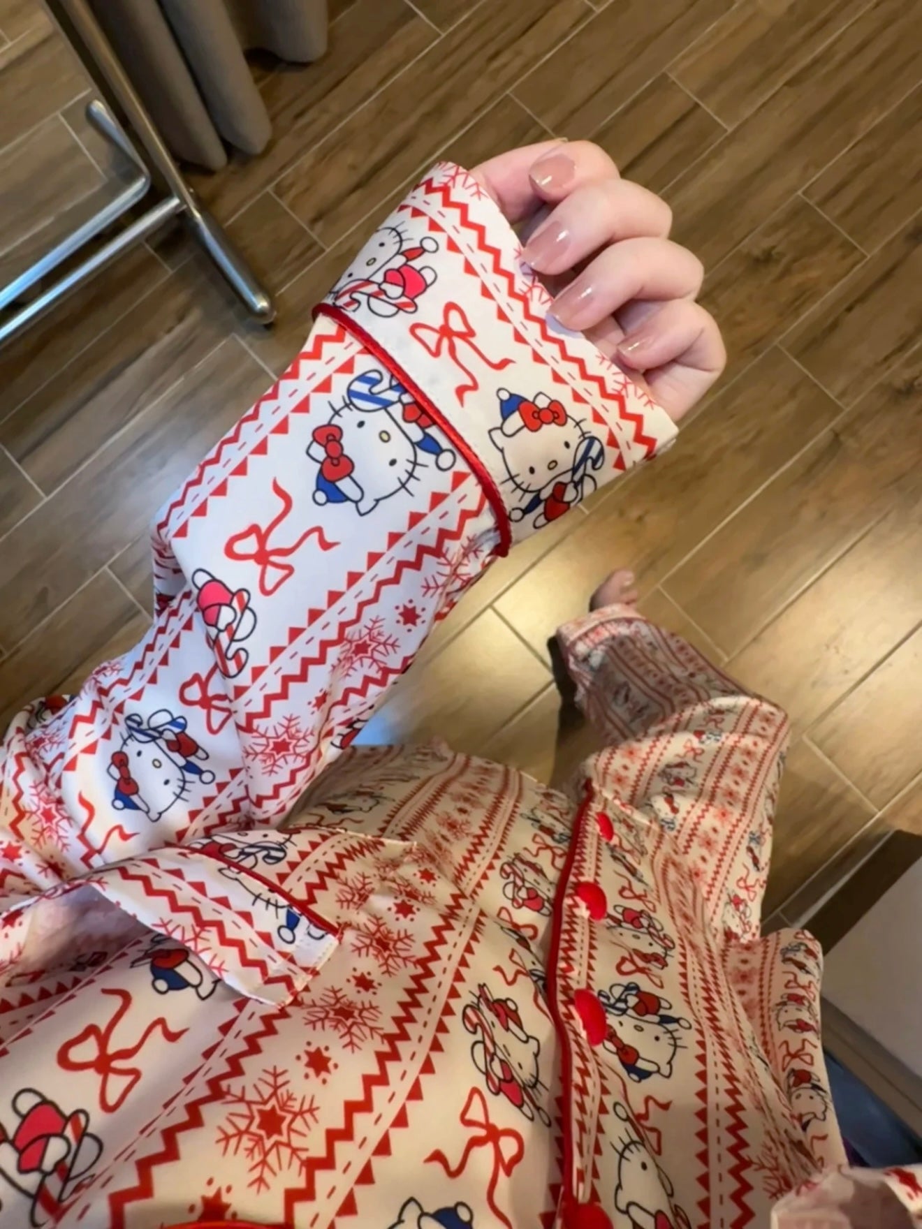 A dreamy and ultra-soft Kitty snowflake pajama set made from smooth milk-silk satin for a cozy, skin-friendly feel. Comes in two styles—long-sleeve top with long pants or short-sleeve top with shorts—perfect for all seasons. Finished with adorable Kitty snowflake details and includes a matching hair tie for a complete cute-and-cozy look. 送发圈~❤️
